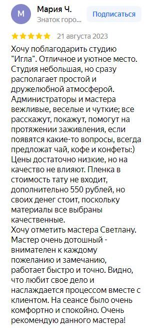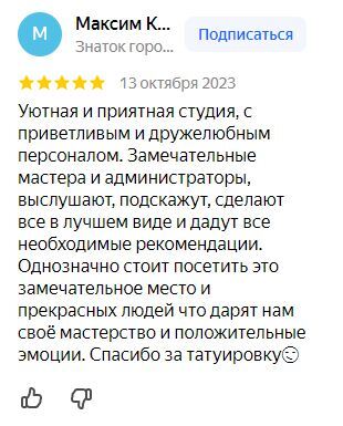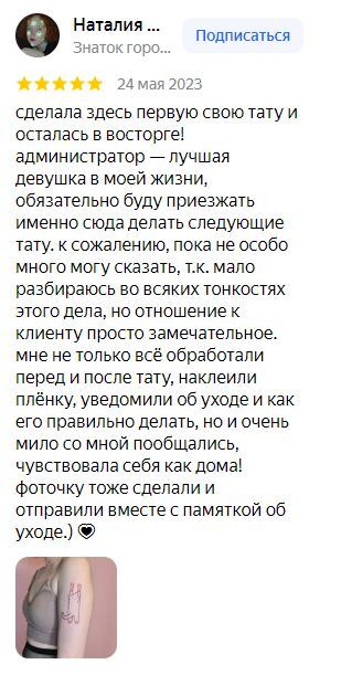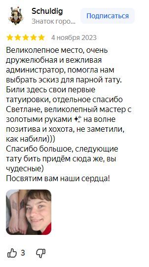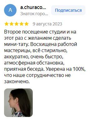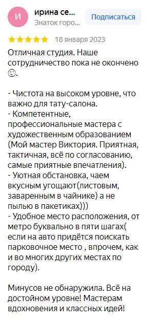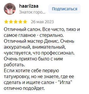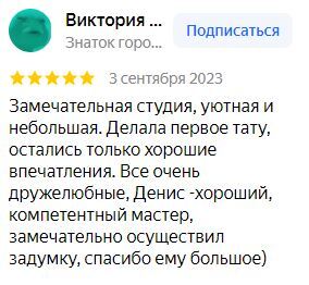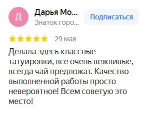Как, уже, опытный тату-мастер я быстро нахожу общий язык со своими клиентами. Как минимум, я следую стандартам безопасности и гигиены, установленным в индустрии татуировки. Ну и конечно же создаю дружественную атмосферу и уют на рабочем месте. Чтобы клиент чувствовал себя расслаблено и в безопасности.